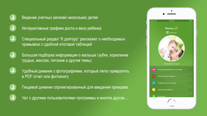 Это приложение поможет Вам проследить за правильным развитием ребенка с рождения до года и далее. - Раздел «Анкета на сегодня» содержит главную актуальную информация по ребенку за весь период: аллергии, серьезные болезни, последние биометрические данные, группа крови, а также размеры одежды, которые ему сейчас подойдут. Добавив в программу часто используемые документы ребенка (полис ОМС, свидетельство о рождении и т.д.) Вы легко сможете просмотреть их через этот раздел. Т.о. эти, часто требуемые, документы будут всегда у Вас под рукой. - Графики диапазонов изменения роста и веса малыша помогут проследить за правильным набором веса и роста. Внеся в программу информацию по измерениям веса и роста Вашего малыша Вы увидите достаточен ли его вес (рост) на данный момент. - Раздел описания развития навыков, таких как - умение ползать, держать спинку, ходить, держать головку, видеть, действовать ручками с подробным описанием и подсветкой того, как малыш должен был продвинуться в каждом из них на текущий момент. Также здесь описывает процесс общения с ребенком, развитие у него игровых навыков - Раздел Игрушки поможет подобрать ребенку развивающую игрушку в тот или иной период его жизни. - Раздел "Зубы" дает возможность проследить динамику появления и выпадения молочных зубов. Есть возможность сравнения динамик роста и выпадения зубов малыша и средне-статистическими данными. - Раздел "Кормление грудью и прикорм" - это дневник питания с группировкой данных по 4 основным группам: 1. Грудное молоко/смесь 2. Кефир и творог 3. Каши 4. Супы и пюре и разделом Другое За каждый день подводятся итоги и отображается изменение относительно предыдущего дня. + на закладку выведена помощь с инфографикой о том когда и как следует вводить прикорм, как заменять грудное кормление или кормление смесью кашами супами и пюре. Предусмотрена возможность выявления пищевого аллергена. После его выявления соответствующий продукт будет подсвечен, а сам аллерген будет занесен в анкету ребенка. - Раздел "К доктору" поможет Вам не забыть об обязательных наблюдениях у врача и прививках. Исходя из указанного дня рождения малыша, программа будет подсвечивать те мероприятия, которые нужно совершить в текущий период и даст возможность пометить те из них, которые Вы уже прошли. В разделе так же содержится информация о болезнях, от которых делаются прививки. - В программу встроен Дневник, в который можно заносить достижения малыша, рекомендации врача, сделанные прививки, замеры температуры, напоминания, добавлять фотографии, биометрические данные, болезни, вес и рост. При этом занося вес и рост – они автоматически отобразятся в виде графика, серьезные болезни попадут в «Анкету малыша» и через некоторое время ненужно будет вспоминать чем и когда ребенок болел, биометрические данные программа использует для определения размера одежды и т.д.. - В дневник интегрирован планировщик приема лекарств. - В дневнике к каждому дню Вы можете прикреплять результаты анализов (фотографии бланков или PDF документы). С помощью встроенного функционала Вы можете объединять несколько фотографий в один PDF документ. Далее, используя поисковый фильтр, Вы легко сможете быстро просматривать те или иные результаты анализов. - Закладка "Расписание на день" покажет на выбранный день все напоминания для ребенк