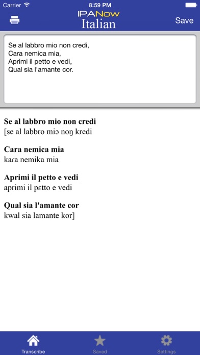 IPANow! by PhoneticSoft is a unique app that automatically transcribes Italian texts into International Phonetic Alphabet (IPA) symbols by applying rules utilized by scholarly lyric diction textbooks. Simply type or paste in a text, tap a button, and IPANow! produces a phonetic transcription underneath each line of text. Key features: *Easy-to-use! Simply type or paste a text in and tap a button. *Copy/paste transcription output to an email or other apps. *Print transcriptions directly from your device (with AirPrint). *Save transcriptions for later. *Customize the transcription output based on your preferences. Designed by a choral conductor and vocalist, IPANow! is a lyric diction resource for choral conductors, professional vocalists, church musicians and music educators, but anyone can use it. IPANow! allows choral directors to easily produce professional-looking phonetic transcriptions of foreign language texts to distribute to choir members. We believe you will find IPANow! an invaluable resource.