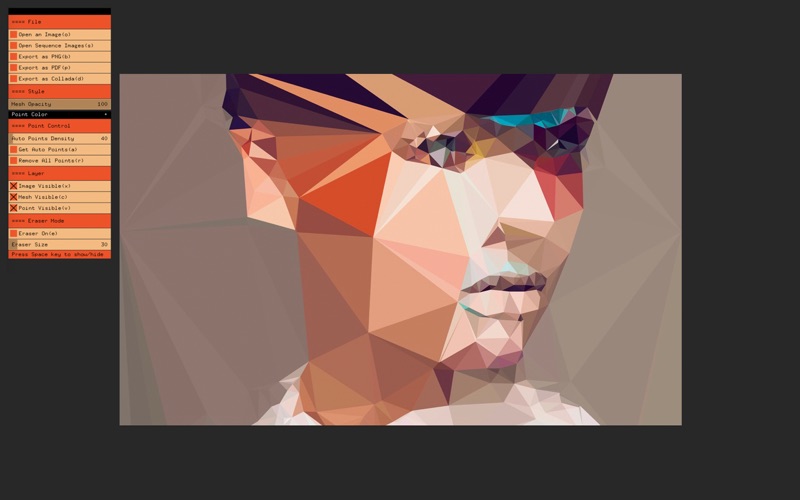 Turns Images Into Techy Artwork! DMesh is a custom creative application that turns images into techy artwork. It works by analyzing an image and generating a triangulation pattern for a beautiful finished product. To build the program, a groundbreaking mix of computer vision technologies were employed to make DMesh for someone without any design background. Check user showcase at the DMesh site. You’ll get an idea of how you use Dmesh for your project. [ Key Features ] Auto Point Generation: DMesh provides auto-generated points, which is useful for people doing animations or larger batches of images. Where other tools only allow manual use, DMesh analyzes the image, adds points and plays with the density accordingly while reducing noise in the mesh. Manual Point Editing Tool: Control the number of mesh points dynamically: add more for a realistic result, or subtract to make the image more abstract. Export as Bitmap... DMesh suuport to export images as bitmaps, vectors or 3D data for maximum flexibility and scope. Computer Vision Technology: Auto Point Generation is built based on computer vision technology so the results are closer to the original source and working with animation files can get more continuity between frames and less noise in the mesh. Working with Sequenced Images (Pro version only): Import/export sequenced images automatically, making it easier for motion designers. Video import/export is in the works. Dynamic Mesh Density Control (Pro version only): This allows users to control number of mesh dynamically so realistic result having more meshes or abstract one having less meshes can be made easily. [ Press ] "DMesh turns any image into a techy artowrk." - Fastcompany "Get triangulated." - Creativity "Latest project that utilises a very similar technique is DMesh, a custom software made in Cinder by Dofl Yun..." - Creative Applications Network