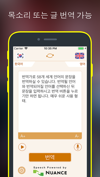 번역가로 58개 세계 언어의 문장을 번역하실 수 있습니다. 번역될 언어와 번역되어질 언어를 선택하신 뒤 문장을 입력하시고 번역 버튼을 누르기만 하면 됩니다. 매우 쉬운 사용 형태. 문장을 타이핑할 필요까지도 없습니다. 그냥 말씀하시면 내용이 문장으로 변환되어 즉각 번역됩니다. 번역물을 이메일이나 문자 메시지(SMS)로 보낼 수도 있고, 페이스북이나 트위터에 올려서 공유할 수도 있습니다. 여러분이 모르는 외국어로 의사소통할 때 꼭 필요한 바로 그런 앱입니다. - 선택한 언어로 문자 번역. - 번역물을 메시지나 이메일로 전송. - 텍스트 또는 번역을 소셜네트워크에서 공유할 수 있습니다. - 다른 아이폰 앱으로 번역물 복사. :: 지원 언어 :: - 아프리칸스어 - 알바니아어 - 아라비아어 - 벨라루스어 - 불가리아어 - 카탈루냐어 - 중국어 - 중국어(번체) - 크로아티아어 - 체코어 - 덴마크어 - 네덜란드어 - 영어 - 에스토니아어 - 필리핀어 - 핀란드어 - 프랑스어 - 독일어 - 그리스어 - 힌디어 - 헝가리어 - 아이슬란드어 - 인도네시아어 - 아일랜드어 - 이탈리아어 - 일본어 - 한국어 - 라트비아어 - 리투아니아어 - 마케도니아어 - 말레이어 - 몰타어 - 노르웨이어 - 폴란드어 - 포르투갈어 - 루마니아어 - 러시아어 - 슬로바키아어 - 슬로베니아어 - 스페인어 - 스와힐리어 - 스웨덴어 - 태국어 - 터키어 - 우크라이나어 - 베트남어 - 웨일즈어 - 아르메니아어 - 아제르바이잔어 - 바스크어 - 그루지아어 - 구자라트어 - 아이티 크리올 - 칸나다어 - 라틴어 - 타밀어 - 텔루구어 - 우르두어 외국에서 의사를 전달하고 싶으신가요? 무엇을 기다리고 있나요? 지금 카피본을 사용해보세요.