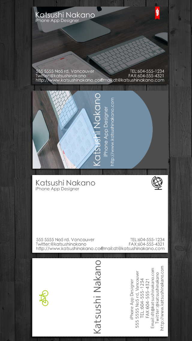 네 가지 간단한 단계에서 사용 방법을 알려 드리겠습니다. BusinessCardDesigner - PDF, AirPrint와 이메일 기능을 갖춘 비즈니스 카드 메이커, 크리에이터, 에디터, 템플릿, 디자인 귀하의 전화 번호.