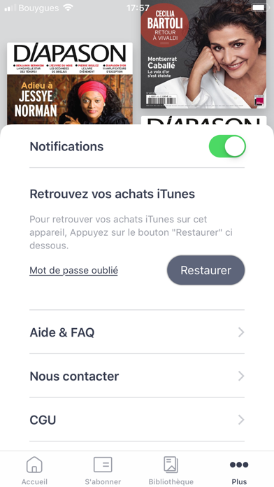 Votre magazine Diapason baisse de prix : 4,99€ au lieu de 5,99€ Le numéro un de la musique classique et de la Hifi. Un regard expert sur l'actualité musicale. En supplément de la vente au numéro, il est possible de s'abonner à Diapason directement depuis l'application grâce à l'une de nos 3 formules : ▶ 1 mois : 4,99€ ▶ 6 mois : 26,99€ ▶ 1 an : 42,99€ Le montant de votre abonnement sera prélevé sur votre compte iTunes après votre confirmation d'achat. L'abonnement auquel vous aurez souscrit vous permettra de télécharger immédiatement le dernier numéro en cours. Les abonnements sont renouvelés automatiquement à moins que vous ne désactiviez cette option au plus tard 24 heures avant la fin de la période en cours. Il n'est pas possible d'annuler un abonnement pendant sa période de validité. L’abonnement et son renouvellement peuvent être gérés dans les réglages de votre compte iTunes. Pour plus d'informations sur la gestion de vos abonnements iTunes: https://support.apple.com/fr-fr/HT202039. Pour plus d'informations sur les mentions légales: http://tiny.cc/mentions_legales. Grâce à votre compte iTunes, synchronisez simplement et facilement vos achats sur l'ensemble de vos appareils Apple. ----------------------- Découvrez également nos autres magazines sur l'AppStore : - Grazia - Closer - Diapason - Top Santé - Réponses Photo - Biba - Modes & Travaux - Les Cahiers de Science&Vie - Science&Vie - Science&Vie Kids - Science&Vie Guerres et Histoire - Science&Vie Junior - 750g Le Mag - L'Ami des Jardins et de la Maison - La Revue Nationale de la Chasse - Grand Gibier - Le Chasseur Français - Pleine Vie