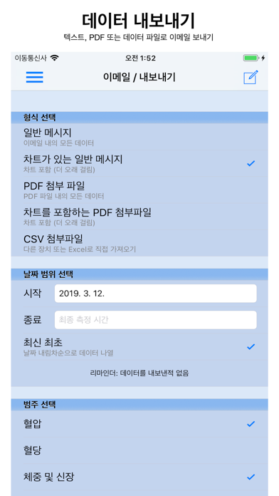 건강 폴더 의료용 트래커는 고객님의 장치를 개인용 건강 모니터로 변신시킵니다. 트래커는 혈압, 혈당, 체중, 신체질량지수, 콜레스테롤 등을 추적할 수 있습니다. 트래커는 평생 데이터 시각화, 통계 보고, 약물 상관관계, 이메일 가져오기/내보내기, 내장 리마인더 등의 기능을 갖추고 있습니다. 이 앱은 여러 기능을 갖추고 있습니다. 종합적 데이터 수집 – 모든 건강 및 의학 수치들을 추적하는 하나의 앱을 갖기를 원하신 적이 있습니까? 이 앱은 여러분을 위해 설계되었습니다. - 사용자 정의 가능 입력 데이터 형식 - 사용자 정의 가능 입력 데이터 형식 - 최적화된 키보드 입력 - 최적화된 키보드 입력 약물 상관관계 – 복용하시는 약에 따라 활력 징후가 어떻게 변하는지 발견하기를 원하신 적이 있습니까? 두 팔에서 혈압이 어떻게 다를까요? 식사에 따라 혈당이 어떻게 바뀔까요? 이 앱은 다음 사항들을 발견하는데 도움이 되도록 설계되었습니다 - 경구 및 주사 약물의 추적 및 상관관계 - 왼쪽/오른쪽 팔의 혈압 측정 추적 및 상관관계 - 식사 유형에 따른 혈당 측정 추적 및 상관관계 - 더 있습니다. 어떤 상관관계를 알 필요가 있는지 저희에게 알려주십시오! 데이터 시각화 – 차트 하나가 천마디보다 낫습니다. 그래픽 차트는 활력 징후에 대한 시각적 동향을 알려줄 뿐만 아니라 경고 표시도 보여줍니다(혈압만 해당). - 모든 활력 징후가 그래픽으로 제시됩니다 - 시간 제한이 없습니다 - 더 많은 데이터 역사가 나타나도록 차트를 스크롤하려면 스와이프하십시오 - 최적화된 차트 그리기 성능 이메일 가져오기/내보내기 – 간단하면서도 다용도인 이메일/내보내기 기능은 진료 제공자들과 손쉽게 통신할 수 있게 합니다. - 여러 내보내기 형식(PDF, CSV, 일반 메시지) 중에서 선택 가능 - 선택 가능한 시작/종료 날짜 범위 - 선택 가능한 내보낼 활력 징후 범주 - 이메일 및 PDF 파일 내에 차트들을 포함할 수도 있습니다 - 가져오기 중의 융통성있는 형식 인식 - 친숙한 가져오기 지침 및 피드백 메시지 다른 많은 부가 기능 - 이중 모드 경과 읽기 보기, 신속한 검색 및 완전한 재이용을 위한 그룹화 - 내장 리마인더, 검진 시간을 절때 놓치지 않게 하는 기능 그리고 iOS 리마인더 앱과의 완벽한 통합 - 여러 사용자 수용, 한 앱으로 전가족 추적 - 조절 가능한 정오 시간, 심지어 “밤부엉이”에게도 오전/오후가 더욱 의미가 있게 됨 - 조절 가능한 경고 한계치(혈압만 해당) - 이중 단위 지원, 미국식과 미터법 참고: 이 앱은 의학용 측정 장치를 구동하지 않습니다. 모든 입력치들이 입력되어야 합니다.