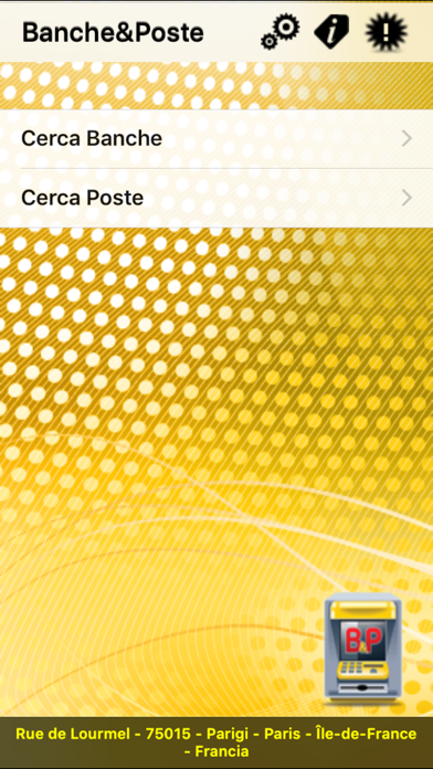 Save money and time searching for the counters of your bank or post offices in Italy closest to your current location! B&P APP lets you record in your profile up to 3 different banks and for each one of these allows you to track down the counters closest to your position by exploiting the potential of GPS, maps and interactive "augmented reality". The same capabilities are available to find the post offices in Italy. It is also possible, through a search engine, to search for all the banks and post offices present in Italian Municipalities, Provinces or Regions. The search engine and augmented reality show with a different color the counters of banks registered in your profile. You can also set the number of kilometers from your location within which to search. B&P uses its own repository where there are: -33.798 branches of the bank -more than 13.100 post offices For each bank branch or post office there are available several information: -Name -Full address -Interactive map -Link to the navigation software -Augmented reality integrated with digital compass -Telephone -e-mail or website (if available) Taking advantage of augmented reality and a digital compass, B&P displays you in full screen the direction in which you can find the closest branches of the bank or post offices. Through an interactive map, O&F shows you the needed route to reach the nearest banks or post offices found. In addition it is possible to transfer these information to the navigation software installed on your iPhone.