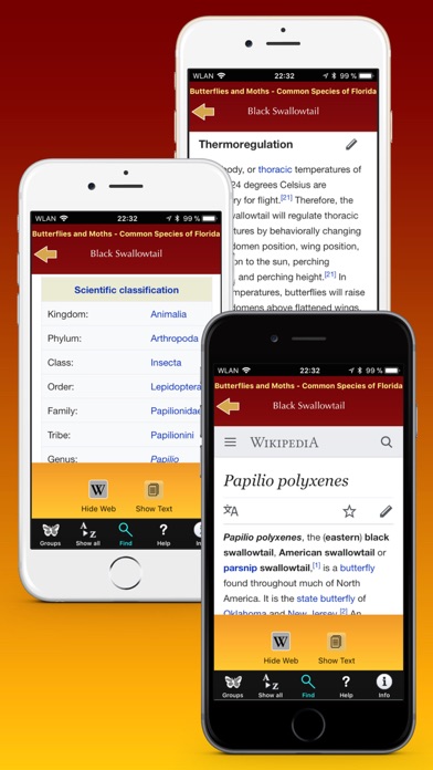 Another app in our Florida Wildlife series... This app shows the 72 most common butterfly and moth species found in southern Florida, including the Everglades National Park. For each species there are two or three high-resolution pictures (also of the caterpillar, if available), a brief description, and a link to view the corresponding Wikipedia pages within the application window. All descriptive information is in English, the species' names are also shown in scientific (Latin) nomination and in German. The app features a modern, intuitive interface with easy navigation and search facilities for finding a butterfly by its name or searching in the full text for features and characteristics. You can also narrow down the search by color and family. If you're interested in Florida's wildlife, don't miss this app which is equally suitable for iPhone and iPad. These butterfly species are shown and described in this app: • American Lady • American Snout • Black Swallowtail • Buckeye • Cabbage White • Caribbean Peacock • Carissima Underwing • Carolina Satyr • Cecropia Moth • Ceraunus Blue • Cloudless Sulphur • Dainty Sulphur • Eastern Tent Caterpillar Moth • Eastern Tiger Swallowtail • Fiery Skipper • Florida Leafwing • Florida Purplewing • Florida White • Georgia Satyr • Giant Leopard Moth • Giant Swallowtail • Gray Hairstreak • Great Purple Hairstreak • Great Southern White • Gulf Fritillary • Hackberry Emperor • Imperial Moth • Io Moth • Julia Heliconian • Large Orange Sulphur • Little Metalmark • Long-tailed Skipper • Luna Moth • Malachite • Mallow Scrub Hairstreak • Mangrove Buckeye • Mangrove Skipper • Monarch • Monk Skipper • Nessus Sphinx Moth • Orange Sulphur • Orange-barred Sulphur • Painted Lady • Painted Lichen Moth • Palamedes Swallowtail • Pearl Crescent • Phaon Crescent • Pink-spotted Hawkmoth • Pipevine Swallowtail • Polyphemus Moth • Queen • Question Mark • Red Admiral • Red-banded Hairstreak • Red-spotted Purple • Rosy Maple Moth • Ruddy Daggerwing • Silver-spotted Skipper • Sleepy Orange • Soldier • Southern Dogface • Southern Hairstreak • Southern Pearly Eye • Tawny Emperor • The Atala • Tiger Mimic-Queen • Tropical Checkered Skipper • Variegated Fritillary • Viceroy • White Peacock • Zebra Longwing • Zebra Swallowtail