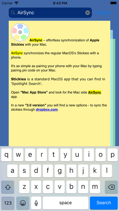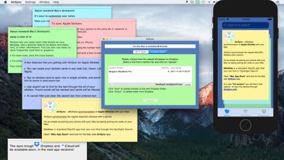 AirSync – effortless synchronization for Apple Stickies with your Mac. AirSync synchronizes the regular MacOS's Stickies with iPhone. It's as simple as typing magic number on your Mac. Make sure both devices are on the same Wi-Fi network. Find in "Mac App Store" the Mac side Application.