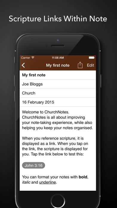 ChurchNotes, while being feature rich, simplifies the process of taking notes and keeping them organised. ChurchNotes is perfect for taking notes during a church service or podcast. While being an ideal solution for speakers to use for their own sermons. SCRIPTURE When you type a scripture reference, it will automatically become a link within your notes. Tapping the link will display the scripture in your desired bible translation. (Check help section for accepted formats). STAY ORGANISED Your notes are automatically organised by date, by speaker and by location. You can also add custom folders to put you in full control of how your organise your notes. Searching through your notes couldn't be faster. SOME FEATURES ● NLT, KJV and ASV Bible Translations available. (more to follow) ● Easily add formatting, such as bold, italic and underline to your notes. ● Change the font face and size of text. ● Create bulleted and numbered lists. ● Handy buttons for undo/redo. ● Supports iPad, iPad mini, iPhone and iPod Touch. SUGGESTIONS If you have any suggestions of how ChurchNotes can be made even better, we would love to hear your ideas. Please visit www.simonsapps.com to get in touch.