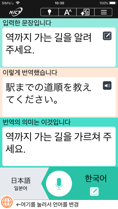 말한 내용을 외국어로 번역하는 음성 번역 앱니다. 다운로드 및 이용은 전부 무료입니다. 31개 언어를 지원하며 보기 쉬운 화면, 간단한 조작으로 번역 결과에 대한 정답 여부도 확인할 수 있습니다. 여행을 더욱더 즐겁게, 외국인에게 더 좋은 편의를 제공하기 위해, 음성 통역 및 번역기로 사용해 보세요! ■특징 VoiceTra(보이스토라)는 정보통신연구기구(NICT)의 연구성과인 고정밀 음성인식, 번역, 음성합성 기술을 활용하여 말한 내용을 번역하고 음성으로 재생합니다. 번역할 언어를의 빠르게 바꿀 수 있으므로 한개의 단말기로 자신과 외국인이 대화할 수 있습니다. 음성 입력을 지원하지 않는 언어는 텍스트 입력으로 번역할 수 있습니다. 여행회화에 특화되어 있으며 다음과 같은 장면에서의 이용을 추천해 드립니다. ・교통: 버스, 전차, 렌터카, 택시, 공항, 트랜짓 ・쇼핑: 레스토랑, 쇼핑, 지불 ・호텔: 체크인, 체크아웃, 취소 ・관광: 해외여행, 일본에서의 접객・응접, 외국인 대응 ※VoiceTra는 방재, 재해 관련 앱으로도 소개 되었습니다. 사전기능으로 단어의 번역에 사용할 수 있지만, 문맥 속에서 단어의 의미를 파악하므로 문장으로서 입력을 권장합니다. ■지원 언어 일본어, 영어, 중국어 (간체), 중국어 (번체), 한국어, 태국어, 프랑스어, 인도네시아어, 베트남어, 스페인어, 미얀마어, 아라비아어, 이탈리아어, 우르두어, 네덜란드어, 크메르어, 싱할라어, 덴마크어, 독일어, 터키어, 네팔어, 헝가리어, 힌디어, 필리핀어, 폴란드어, 포르투갈어, 포르투갈어 (브라질), 말레이어, 몽골어, 라오스어, 러시아어 ■ 제한 사항 등 인터넷 접속이 가능한 환경이 필요합니다. 통신 상태에 따라 번역 결과의 표시에 시간이 걸릴 수 있습니다. 번역할 문장을 텍스트로 입력 할 수 있는 언어는 OS에서 해당 언어의 키보드 입력을 지원하는 언어입니다. 단말기에 필요한 글꼴이 포함되어 있지 않은 경우에는 문자가 제대로 표시되지 않을 수 있습니다. 서버에 이상이 있을 경우에는 일부 기능 또는 애플리케이션을 사용할 수 없게 되는 불가피한 경우가 있사오니 양해 바랍니다. 이 애플리케이션을 사용하기 위한 통신료는 이용자 부담입니다. 해외 로밍의 경우 통신 비용이 고액이 될 수 있으므로 주의하시기 바랍니다. 각종 기록 내용은 음성 번역 기술의 향상을 위해 이용됩니다.