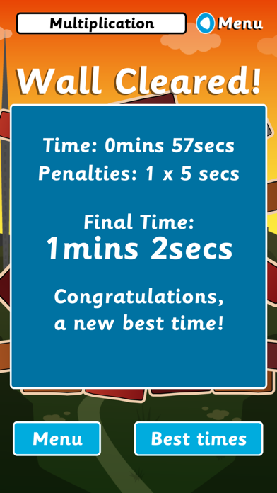 Learning the times tables can be fun! Smash your way through walls and make remembering those multiplication/division facts enjoyable. The object of Wipeout Wall is to break down the wall in the quickest time by correctly knocking out the bricks displaying the answer to the multiplication/division problem. Wipeout Wall (Multiplication & Division) at a glance: *covers Multiplication and Division skills for Ages 4 - Adult. *choose to practise individual facts or groups of facts. * 32 levels *best times are saved for every level. *there's no rubble to clear up after the wall has been destroyed! Keep up to date with all of Primary Games Ltd's development on Facebook: www.facebook.com/iRPrimaryGames