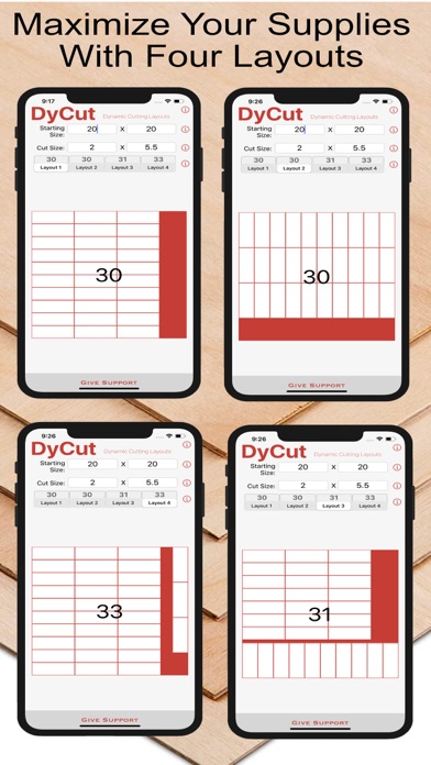 DyCut calculates 4 dynamic layouts to maximize your materials. Getting the most out of your raw material helps you save money, improve output, and reduce waste. DyCut provides value to professional applications such as, manufacturing, carpentry, printing, framing, etc.. DyCut also comes in handy for personal and hobby pursuits like scrapbooking, card making, and quilting, and more. Our goal at Courtney & Company is to provide you with applications to make your life easier. We ask, as DyCut saves you money you consider donating a portion of your savings to support our development efforts. Features: * Starting Size * Cut Size * Effortless calculations * 4 dynamic layouts * Layout preview Customer Review: "I own a plastics company and we use PVC sheets that are 26" x 52". We cut thousands of sizes as we do a lot of custom work. These are thin sheets, .015 being most common, and we cut them on a Polar Cutter (paper cutter). So just testing this on one piece we do that we usually get 27 per sheet on, this program, showed me how we can get 28 per sheet by rotating the last row of pieces. That alone will save me approx $8500 a year. Just for that one piece! We do 2.5 million of this piece yearly. THANK YOU" - imtigger2 How To Calculate: 1. Enter the dimensions of the sheet you will be cutting. 2. Enter the size you want cut. 3. View layout options. 4. Pick your favorite. Whether you are a professional who cuts large sheets, or a household scrapbooker this app will help you get the most out of your material.