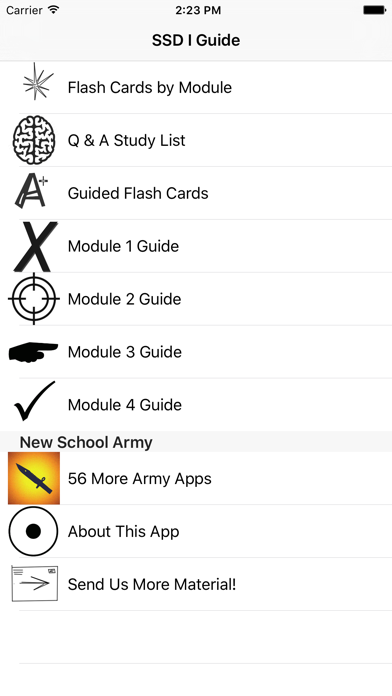 This app is Structured Self Development Level I reference and study guide. This is not a test cheat sheet. All information comes from Army regulations approved for public release. This app has EVERYTHING you will find in Structured Self Development Level I. SSD Level I must be completed by all Soldiers prior to attending the Warrior Leader Course. The actual SSD course contains tons of good information for troops. The problem is you only get to see it once while taking the course and ALMS is a terrible system if you want to review information. Complete information on all 4 modules and 34 SSD topics: MODULE 1 Army Writing Style Combat Reporting Composite Risk Management Detainee Operations Fratricide History of the NCO mTBI & PTSD Personnel Recovery Self Directed Learning Principles MODULE 2 Army Customs COIN Multiple Deployment Psychology Leadership Military Problem Solving Process Physical Readiness Training Troop Leading Procedures MODULE 3 Casualty Assistance Conflict Management Lean Six Sigma Recruiting and Retention Prepare a Brief Joint Service Management Supply Activities Rehearsals MODULE 4 AAR Process Army Ethics Formations History of the U.S. Army Environmental Financial Readiness Time Management Task Organize Bonus: Think you know your stuff? Try out one of seven SSD practice exams in flash card format.