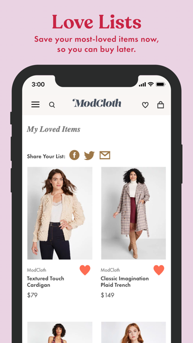 At ModCloth, we design vintage-inspired pieces made relevant to today’s women. Crafted by a team of in-house designers — signature styles include hand-drawn prints, unexpected silhouettes, and an inclusive size range that celebrates all women. Did we mention they’re also endlessly versatile and most importantly, fun? So in other words, we never go out of style. Why Should You Download ModCloth Today? See above. But also, below. Gain Early Access — If you download our app today, you’ll always stay in the loop about major deals and exclusive offers. So in other words, you’ll become the VIP we’ve always thought you were. Be in the Know — Our mentality? Out with the old, always! We’re constantly dropping new arrivals, brand partnerships, social sweepstakes, designer collaborations, and more. Just. Keep. Refreshing. Shop Without the Hassle — See an item you love? You can *literally* heart it and save it to your Love List. Our fast and secure checkout also makes your add-to-carting as easy as 1, 2, 3. Get Cute Clothes — In case you hadn’t noticed, our clothes are like, really cute. Don’t believe us? We guess you’ll have to download the app to find out yourself.