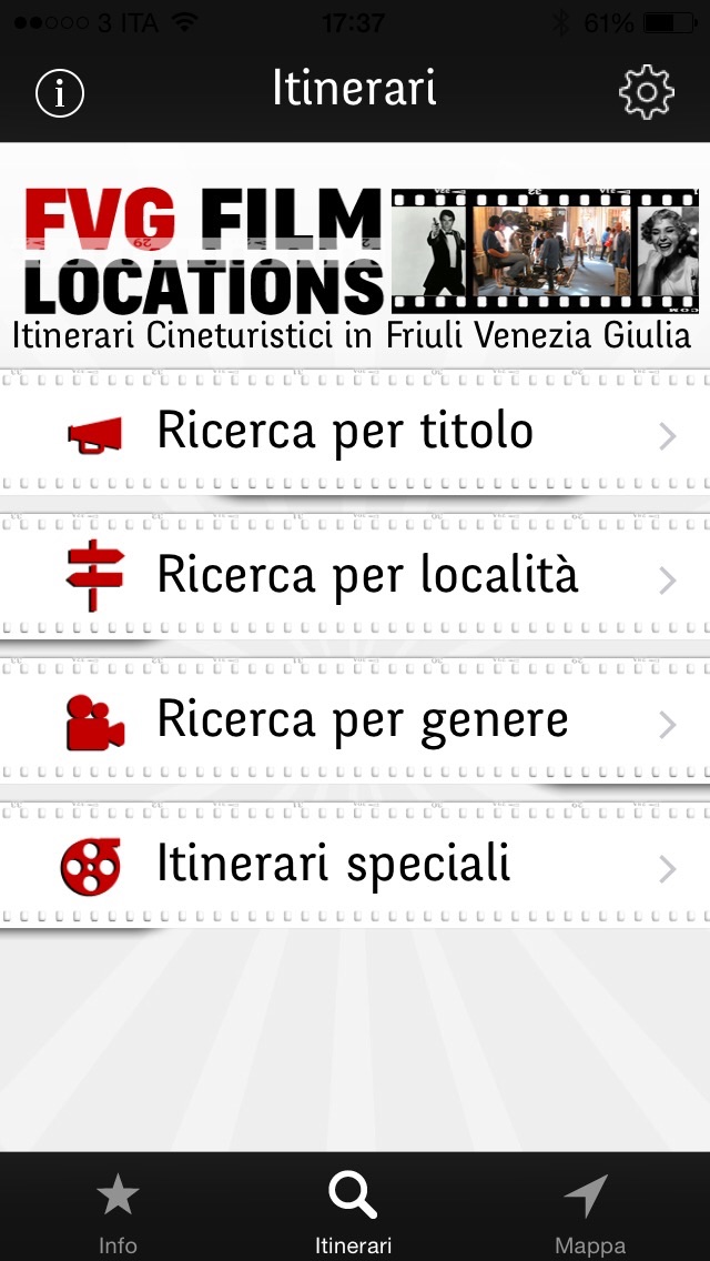 IT >> Il Friuli Venezia Giulia è una regione in cui si compenetrano natura, storia, tradizione e cultura in una amalgama di paesaggi e di atmosfere suggestive. Alle montagne, ai pascoli e ai boschi succede la cerchia collinare, scendendo si incontra la pianura, la zona delle risorgive e poi la laguna e la costa marina. Ippolito Nievo lo definì un “piccolo compendio dell’universo”. Proprio la ricchezza di paesaggi naturali, storia e cultura richiamano registi e troupe cinematografiche che decidono di ambientare in questi luoghi le loro pellicole. La guida consente un viaggio curioso e innovativo alla scoperta dei set cinematografici del Friuli Venezia Giulia ed è un invito alla scoperta di un territorio e dei suoi luoghi, dai più celebri ai meno conosciuti. La guida, rivolta ad appassionati, turisti e curiosi, contiene una selezione di circa 60 tra film, fiction e videoclip suddivisi in 300 punti di interesse diffusi tra le province di Trieste, Udine, Gorizia e Pordenone. Ogni film è corredato da una scheda di approfondimento con informazioni sulla pellicola, una breve trama, qualche curiosità, cenni storici delle scene e una galleria fotografica. I contenuti possono essere condivisi su Facebook e Twitter. Attraverso questo progetto si è voluto così proporre una nuova chiave di lettura per scoprire, interpretare e vivere il Friuli Venezia Giulia e un nuovo modo di fare turismo. SLO >> Furlanija Julijska krajina je slikovita dežela, kjer se narava, zgodovina, tradicija in kultura zlivajo v eno ter ustvarjajo prijetno vzdušje v čudovitem okolju. Tukaj lahko občudujemo gore, pašnike in gozdove, ki preidejo v gričevnati obroč. Nekoliko nižje pridemo do nižine, območja z vodnimi izviri, ob morju pa si lahko ogledujemo obalo in laguno. Ippolito Nievo je pokrajino opisal kot »majhen povzetek vesolja«. Ravno bogatost z naravo, zgodovino in kulturo privablja režiserje in snemalne ekipe, da za svoje filme izberejo prav te kraje. Z vodičem boste skozi drugačno in nenavadno potovanje odkrili filmska prizorišča v Furlaniji Julijski krajini, hkrati pa spoznali pokrajino ter njene znane in manj znane kraje. Vodič je namenjen navdušencem, turistom in radovednežem. Zajema več kot 60 filmov, tako celovečernih kot tudi TV-nadaljevank in videospotov, ki so razdeljeni na 300 interesnih točk, razpršenih po pokrajinah Trsta, Vidma, Gorice in Pordenona. Vsak film spremljata datoteka s podrobnejšimi informacijami, krajšim opisom vsebine, zanimivostmi in krajšim zgodovinskim pregledom prizora ter fotogalerija. Vsebine se lahko delijo po socialnih omrežij in pošiljajo po elektronski pošti. Namen projekta je bil, da bi z obiskom turističnih krajev, slikovitih pokrajin in neokrnjene narave omogočili drugačno perspektivo pri odkrivanju, razumevanju in doživljanju Furlanije Julijske krajine.