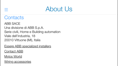 A stylish and highly functional app to allow you to discover Mylos, ABB's new integrated system that meets all your comfort and automation requirements in terms of your home electrical system. - In the Catalogue section, you can move around easily to see the full range of Mylos finishes; with a simple touch you can view their features and the relevant order codes. - You can save your choices to your Favourites and share them with your friends or send them to your trusted electrician for a cost estimate, selecting from e-mail, Facebook, Twitter and any other compatible sharing apps installed on your devices. - By selecting Configurator, you can customise the Mylos finishes, choosing from the materials and shapes available, including the innovative finishes and materials offered by the exclusive partners with the Mylos Ultra series. You can view the light source both with standard devices and with home devices, even adding a logo for complete customisation. - Simulate the final effect of the selected finish on the walls of your home with the MyMylos function. - In the Barcode section, you can identify any product in the Mylos range, simply by focusing your camera on the product label available on the package.