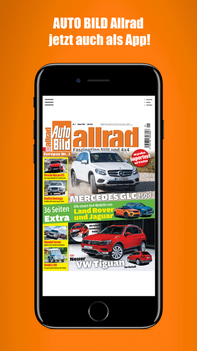 AUTO BILD Allrad ist Europas größte Allrad-Zeitschrift. Lifestyle verbunden mit herausragender Technik sind die Erfolgsfaktoren dieses Hochglanz-Magazins. Das Monats-Magazin mit News, Trends und Inspirationen aus der neuen 4x4-Welt vermittelt Sicherheit, Optik und Fahrspaß für alle Allrad-Fans. Der Leser findet in jeder Ausgabe ausführliche Tests und Fahrberichte sowie Zubehör-Vorstellungen im Geländewagen-Segment. Neben der 4x4-Erlebniswelt konzentriert sich der Titel auf die praktischen Dinge des 4x4-Alltags auf der Straße und im Gelände. Mit dieser App können Sie die aktuelle Ausgabe der AUTO BILD Allrad für 3,99 Euro kaufen. Alle in der App gekauften Ausgaben bleiben erhalten, so dass Sie auch zu einem späteren Zeitpunkt jederzeit in älteren Ausgaben stöbern können. Ihr Feedback zur AUTO BILD Allrad App interessiert uns. Bitte wenden Sie sich bei Fragen, Meinungen, Verbesserungsvorschlägen sowie technischen Problemen an [email protected]. Wir werden uns dann schnellstmöglich bei Ihnen melden. Bitte haben Sie Verständnis dafür, dass wir Ihre Fragen in den iTunes-Bewertungen leider nicht beantworten können. Wenn Ihnen die App gefällt, freuen wir uns über eine positive Bewertung im App Store. Vielen Dank! Und so geht's: 1. Laden Sie sich die AUTO BILD Allrad App auf Ihr iPad oder iPhone herunter. 2. Sobald die App heruntergeladen ist, können Sie diese starten und innerhalb der App die aktuelle Ausgabe für 3,99 Euro erwerben oder eines der angebotenen Abonnements abschließen. Die AUTO BILD ALLRAD können Sie auch abonnieren – und ganz bequem über iTunes bezahlen. 3 Monate für 9,99 Euro und ein Jahr für 37,99 Euro. Einzelausgaben sind für jeweils 3,99 Euro erhältlich. Die Abrechnung erfolgt bequem über den iTunes Account. Abonnements können Sie über die Einstellungen Ihres Gerätes verwalten und jederzeit kündigen. (Hinweis: Das Abonnement verlängert sich automatisch, wenn es nicht innerhalb von 24 Stunden vor Ablauf des aktuellen Abo-Zeitraums gekündigt wird. Die Berechnung des neuen Abonnements erfolgt innerhalb von 24 Stunden vor Ablauf des aktuellen Abonnements bequem über Ihren iTunes Account. Diese Funktion lässt sich im Gerätemenü deaktivieren.) Die AGB von AUTO BILD finden Sie hier: http://www.autobild.de/ipad-datenschutz-1334039.html