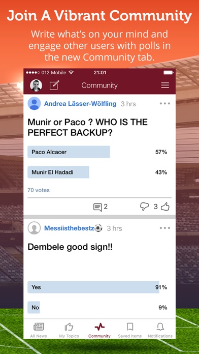 **All the news & videos about Barca FC in a single totally free app! Now with an all new interface and a new comment system!** Barcelona News cover all main football sources, blogs and Youtube channels to bring you a clean & effective summary to follow the club you love ! Features include: * A news summary covering stories from all sources ! For each story - see all sources that covered it with a simple tap ! * Push notifications for important news and/or your chosen topics (optional)! * Live scoreboard for Barcelona FC matches. * Videos from Youtube channels - all about Barça. * Customized news feed - choose your favorite topics and/or the topics you want blocked and get a news feed tailor made just for you! Don't bother yourself with news that don't interest you! * A community of Barca fans! Post stories or polls, comment on stories, and tag articles! * Blocking unwanted sources - you can now filter-out entirely any source you don't want in featured in the app! * Read later - save interesting stories for later reading inside the app. iPhone only features - * Collapsed mode - a mode that allows you to skim through the news quickly and efficiently and decide what you want to read! Loved it? Let us know by rating us high and share it with your friends! Use of the Sportfusion Application is governed by the Sportfusion Terms of Use (http://sportfusion.com/terms-privacy-policy).