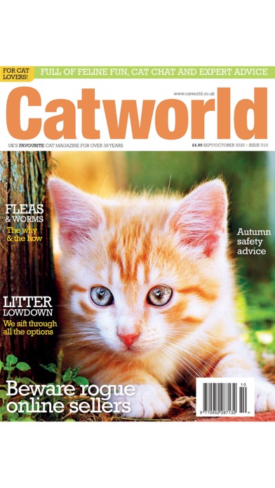 Cat World is the UK's favourite cat magazine. For over 30 years we've been entertaining and advising cat lovers all over the country. Our passionate editorial team are all dedicated cat lovers and ensure each issue is full of inspiring features and wonderful stories. Our team of expert professionals also provide all the invaluable advice that caring owners and breeders require – from health and nutrition to behaviour and grooming. We bring you in-depth breed profiles and news from the rescue centres, and if you're looking for a pedigree kitten you won't want to miss our comprehensive Kittens for Sale section. --------------------------------------- Free app with purchasable content within. Within the app users can purchase the current issue and back issues. Subscriptions are also available within the application. A subscription will start from the next released issue. Available subscriptions are: 12 months: £39.99/ US$49.99 (12 Issues) 3 Back Issues: £9.99/US$13.99 -The subscription will renew automatically unless cancelled more than 24 hours before the end of the current period, you will be charged for renewal within 24 hours of the end of the current period, for the same duration and at the current subscription rate for the product. -You may turn off the auto-renewal of subscriptions through your Account Settings, however you are not able to cancel the current subscription during its active period. -Payment will charged to your iTunes account at confirmation of purchase and any unused portion of a free trial period, if offered, will be forfeited when a subscription to that publication is purchased Bundles of single issues can be also be bought within the application. To use purchased credits, simply click on the issue price and select ‘use credit’. This allows you to purchase back issues at reduced prices. Users can register for/ login to a pocketmags account in-app. This will protect their issues in the case of a lost device and allow browsing of purchases on multiple platforms. Existing pocketmags users can retrieve their purchases by logging into their account. We recommend loading the app for the first time in a wi-fi area so that all issue data is retrieved. If your app will not load past the splash page after a first install or an update please delete and reinstall the app from the App Store Help and frequently asked questions be accessed in-app and on pocketmags. If you have any problems at all please do not hesitate to contact us: [email protected] -------------------- You can find our privacy policy here: http://www.pocketmags.com/privacy.aspx You can find our terms and conditions here: http://www.pocketmags.com/terms.aspx