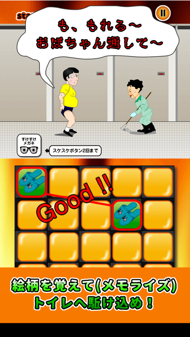漏れそうなのに、なんとトイレは掃除中ーーー?! しかし、掃除のおばちゃんが出すパズルゲームを解くと、個室にはいれるみたいだぞ! きみの記憶力で、トイレの個室を勝ち取るんだ! ■□ ゲームの遊び方 □■ ゲームはいたって簡単! 制限時間内に20個のパネルの絵合わせ(えあわせ)パズルを完成させればクリア。 間違えると、掃除のおばちゃんが攻撃してくるぞ! ステージは全部で9ステージ。 さまざまな掃除のおばちゃんを回避して、あなたは無事に脱◎できるのか?! ■□ お助けグッズ「すけすけメガネ」を使おう! □■ パネルの中味が透けて見えちゃう「すけすけメガネ」が2回まで使えるから、うまく使って漏らさないようにね! 漏らしたら人間失格決定だ!! ■□ こんな人におススメ □■ ・脳トレゲームをやりたい。 ・通勤中に簡単なゲームを楽しみたい。 ・最近記憶力が悪くなってきた。 ・トイレトレーニングも記憶力も不安。 ・お下品なゲームが大好き。 ====== 音楽: 魔王魂