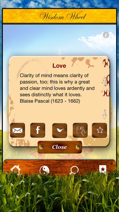• Ask the Wisdom Wheel for advices that provide encouragement and inspiration! • Spin the magic Wisdom Wheel to get support and guidance in your life! • You’ll see: The Wisdom Wheel will help you to cope with life's daily challenges and any situation that may arise! ——————————————— Spin the Wisdom Wheel ——————————————— How it works? Very simple! Everytime you’re looking for an inspiration or a pointer on which way to go, this app is right by your side. You just have to spin the magic Wisdom Wheel – and soon it shows you the path you should follow. ——————————————— Wise inspirations: How to make the most of your life ——————————————— • Get new Ideas! • Handle with wisdom and care! • Handle a crisis! • Take your chances! • Make your wishes come true! • Find inner strength! • Live a life in love! • Calm down and relax! • Have faith! • Make the right decisions! • Be full of joy! ——————————————— Sections ——————————————— ● Favorites section ● Search all advices and prophecies by full text search ● Give readings anywhere and anytime ——————————————— SHARING ——————————————— ● Facebook ● Twitter ● E-mail ——————————————— USABILITY ——————————————— ● Easy navigation ● Day and night effect ● Universal App (iPhone and iPad)