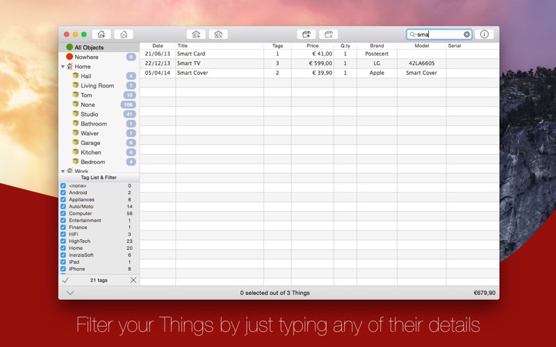 If you need assistance, please refer to our Technical Support Team by clicking the link on the right of this page. If you have an idea for a new feature that could be useful for you, please contact us and we will be glad to consider it! === InerziaThings is your personal archive to keep all your Things under control. When did I purchase my new Mac? How much did I pay my last car? When the warranty of the washing machine will expire? I would like to read the technical data of the audio amplifier without having to remove the whole rack... InerziaThings can answer to all of these questions! Key features: • Management of all the important data (name, brand, model, serial number, warranty expiring date, shop, the date we sold it at what price, etc….) • Formatted free text notes. • Tags management (name change, one or more tag per Thing, automatic tag creation, auto-complete while typing). • Insert and manage images linked to a Thing: import, export, delete, open in default application. • Assign a Thing to a room within a place; a place can have more than one room. A Thing can be assigned to nowhere (not related to a room). • Search by name, brand, model, text within notes • Filter Things on place, room, tags. • Searching and filtering are one another compatible (that is: I want to find all objects in a room of a defined brand and with certain tags). • Automatic calculation of the total value of the visible objects • Unified management of more than one identical Things and their partial selling in one record • Complete Undo support. • Export Things in a text file (comma or tab delimited, ready to be imported in a Office suite). • Export all Things data, with Tag and Images in a proprietary format for backup or transport purposes • Objects multi-page print. • New exciting features to come! NOTE: This Lite version is limited with regards to the number of Places, Room and Things.