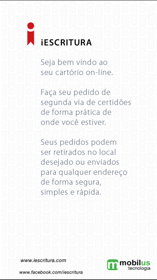 iEscritura, o seu Cartório de bolso! Já imaginou o seu Cartório sem filas, sem burocracia e sem trânsito? O único aplicativo de pedido e pagamento de segunda via de certidão em Cartórios do mundo. Viemos para revolucionar e trazer mobilidade e agilidade ainda mais para o seu dia a dia. Com o iEscritura você consegue fazer o pedido de segunda via certidão, pagamento e escolhe o endereço a ser enviado o documento solicitado, tudo muito prático e rápido. Prazer, somos o iEscritura.