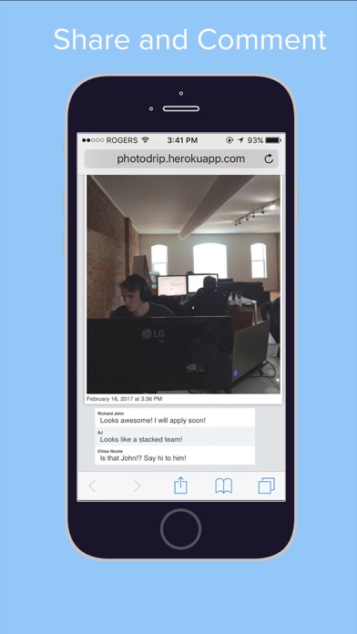 Photodrip allows you to show anyone what's in front of you. Simply select a recipient and start snapping pictures. The recipient receives your images instantly and continuously. Viewable from any device or computer: - Your photos get sent to a custom web address. Anyone with access to the address will be able to view on any device, instantly. Super easy to use: - We want to make it easy for you to share what you are looking at. Select a recipient and start snapping pics. That’s all there is to it. • Launch app. • Take photos. • Within 1 - 3 seconds recipients will see the photo you have taken. • Invite by SMS, email, phone conversation. • Images are not added to your Camera Roll. • No accounts to set up. • Recipients only need a web browser, no app required. • Recipients can comment on photos.