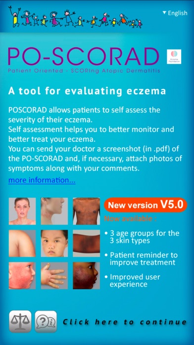 POSCORAD allows patients to self assess the severity of their eczema. This app is available in 24 languages. The PO-SCORAD App was designed and developed by the Eczema Foundation based on the SCORAD Tool, with the assistance of Professor Jean-François Stalder. •Publisher Fondation Eczéma (Eczema Foundation ) Hôtel Dieu Saint Jacques 2, Rue Viguerie 31 025 Toulouse France •Publication Director Doctor Georges Farah – President, Eczema Foundation Scoring of eczema symptoms that Users enter into the App to calculate the PO-SCORAD Index based on the following criteria: extent of the eczema, intensity of the eczema, severity of the itching and sleep disturbance. Each criterion is assigned a weighting coefficient. Eczema symptom scoring tool that produces the PO-SCORAD Indexes, developed and validated in 1990 by a panel of experts, the European Task Force on Atopic Dermatitis. The App and the PO-SCORAD Index do not provide medical advice, are not a tool to diagnose eczema and in no way constitute a substitute for a medical visit which, alone, can allow for a diagnosis to be made and a treatment protocol to be put in place suited to each individual's needs. The PO-SCORAD Index is calculated based on Scores resulting from self-evaluations. The PO-SCORAD Index is therefore the result of self-evaluation scoring that provides an overview of the severity of the eczema. The App's Information must not be used to provide a medical opinion and replace a visit to a healthcare professional. The Information the App provides is intended to improve - not replace - the relationship that exists between a patient and his or her doctor.