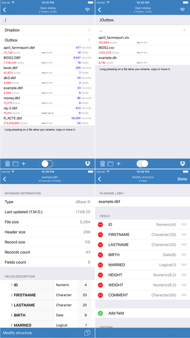 It is a powerful dbf viewer and editor that lets individuals and business users access dbf files. You can view dbf files, view a structure of files; general statistics about the file: type of file, size, number of records and fields; you can upload dbf files via web-browser; you can perform search, set a filter, change an order of information. You can edit your dbf files. Just click on a field and enter any text, numbers, dates etc. Besides you can perform a lot of functions: - set or remove deletion mark - append records - insert records - delete records - perform pack, truncate, zap commands You can create new dbf files and modify a structure of existing dbf files. You can export information to CSV, TXT, XLS, XLSX, SQLite, HTML formats. You can select various options to customize the output file. You can review the output file in the internal viewer and also open this file in different programs that are associated with .txt, .csv, .xls, .xlsx, .db, .html extension. In the OpenDialog you can - create folders - rename files and folders - copy files - access Dropbox: download and upload files - send files by email