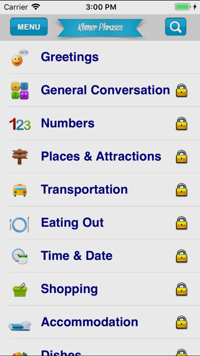 SpeakKhmer provides a large collection of commonly used daily phrases in Khmer with nearly 1000 phrases divided into 21 categories. "It's aimed at Tourists visiting Cambodia or Foreigners who live in Cambodia." Included pictures help to illustrate some unique things or places in Cambodia, ex. how Khmer greet each other... The voices are recorded at slow pace so you can also learn to speak from the phrases. Features: -Phrases are categorized -Favorite helps to save frequently used phrases -Quick search for easy and quick access to what you want to say -Pictures to illustrate some unique stuff like Khmer Foods, Fruits.... -Phonetic transliteration -Volume controls -Side Menu makes it easy to use navigate Categories: -Greetings -General Conversation -Tourist Attractions -Numbers -Trouble -Places & Attractions -Transportation -Eating Out -Time & Date -Shopping -Accommodation -Colors -Emergency -Vowels -Consonants -Food & Drink -Fruits -Important Places -Bank -Leisure & Sports -Dishes -Doctor & Hospital