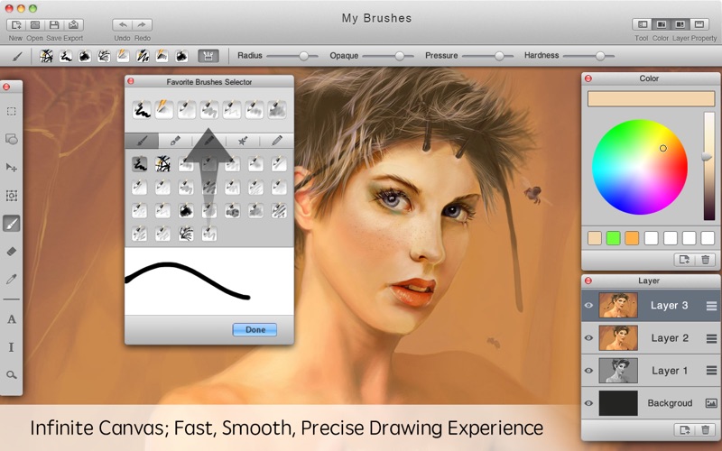 On Sale from $29.99. Pay one time only. Get FREE regular updates and technical support forever. Download Now! MyBrushes는 이미지를 생성하기 위해 고안된 특별한 그리기 애플리케이션으로서 무한한 크기의 캔바스에 그리기 전체 과정을 재생합니다. ‘무제한’ 실행 취소/재실행 단계를 통해 ‘무제한’ 레이어를 지원합니다. 텍스트 입력과 즉석 영상 처리를 지원합니다. 당신이 상상한 것을 전문적인 아티스트가 스케치한 것처럼 나타내는 최고의 독창적인 플랫폼입니다. MyBrushes 의 인터페이스는 쉽고 간단해서 RGB, HSV 등의 같은 컬러 시스템에 대한 지식이 없어도 다양한 브러쉬 컬렉션에서 배경 템플릿을 선택하기만 하면 쉽게 작품을 만들 수 있습니다. MyBrushes는 당신이 무엇을 하든 단순하고 쉽게 구현해 냅니다. 이 어플리케이션은 수채화, 유화, 중국 회화, 드로잉, 중국 서예 등 직접 붓으로 그리는 것과 같은 효과를 재현하며 이를 위해 100가지의 실제 같은 브러시 스타일을 지원합니다.놀라운 페인팅 엔진과 우수한 데스크탑 기능을 가진 MyBrushes는 전문 일러스트레이터에게 현명한 선택입니다. 이 응용 프로그램을 사용하여 당신은 쉽게 그림을 그리고, 색을 칠하고 어디에서든 당신의 작품을 쉽게 미술 애호가들과 공유할 수 있습니다. 특징 및 핵심 기능: - 레이어 구성 시스템: • 무제한 레이어(물론, 각각의 모든 레이어가 ‘무제한’ 크기입니다!). • 레이어를 작성하고 삭제하고 재정렬합니다. • 레이어를 복제하고 지웁니다. • 레이어을 복사하고 붙입니다. • 포토 라이브러리에서 이미지를 불러옵니다. • 레이어의 번역, 회전, 크기 조정을 지원합니다. • 이미지 알파 채널 • Mybrushes로의 다음과 같은 여러 이미지 형식의 가져오기를 지원합니다: JPG,BMP,PNG,GIF,PDF,PSD,PNT,RGB,ARW,BMPF,CUR,CRW,CR2,DCR,DNG,EPSF,EPSI,EPI,EPS, EXR,EFX,ERF,FPX,FPIX,FAX,FFF,GIFF,G3,HDR,ICNS,ICO,JP2,JFX,JFAX,JPE,JFIF,JPF,MPO,MAC, MRW,MOS,NRW,NEF,ORF,PICT,PIC,PCT,PS,PNTG,PNGF,PEF,QTIF,QTI,RAW,RAF,RW2,RWL, SR2,SRF,SRW,SGI,TRIC,TIFF,TGA,TARGA,TIF,XBM,3FR,8BPS - 고유한 페인팅 스튜디오 기능: • 무한한 크기의 캔바스 • 그림을 그리는 과정은 언제 어디서나 다시 재생해 볼 수 있습니다. • 강력한 페인팅 엔진으로 신속한 페인팅 및 원활하고 즉각적인 페인팅을 지원합니다(정밀도 및 성능). • 레티나 디스플레이를 지원합니다. • 세로형 및 가로형 모드를 모두 지원합니다. - 고급 브러시 시스템: • 연속적인 자동 저장으로 다시 작업할 필요가 없습니다. • 압력 감도는 조정할 수 있습니다. • 다양한 형태의 고품질의 천연 브러쉬(브러시, 연필, 펜, 에어 브러쉬, 수채화 브러시, 초크, 목탄, 네온 펜, 특수 효과 펜) 가 제공됩니다. • 슬라이더로 브러시 크기를 조절할 수 있습니다 - 간편하고 탁월한 인터페이스: • 지우개 도구로 실수를 바로잡을 수 있습니다. • 당신의 모바일 기기에서 가져온 이미지 위에 그림을 그릴 수 있습니다. - 아트워크 갤러리: • 이미지 파일을 내보낼 수 있습니다. 본인의 아트워크를 전체적인 하나의 작품으로 내보낼지 품질을 보존한 상태에서 여러 블록으로 나누어 내보낼지 선택할 수 있습니다. • 50가지 배경 템플릿이 제공됩니다. • 페이스북, 트위터, 이메일 등으로 당신의 예술 작품을 공유할 수 있습니다. 개선을 위한 모든 제안은 고맙게 생각합니다. 피드백은 다음으로 보내주십시오:[email protected]