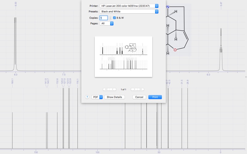 App to predict 13C and 1H NMR spectra: draw a structure to see its spectrum. The accuracy of the algorithm is about 1.9 ppm for 13C and 0.21 ppm for 1H (RMSD=3.4 and 0.31 ppm correspondingly). The number of heavy atoms in structure to predict for free is restricted to 12 atoms. This restriction can be removed by purchasing additional licenses. - Draw chemical structure; - Instantly re-calculate spectrum while changing structure; - Exchange data with mobile devices via iCloud; - Print report; - Zoom in spectrum; - Option to display chemical shift values on structure; - Simple clean interface. The mobile version is available in App Store: http://itunes.apple.com/app/nmr-prediction/id662859811 The prediction algorithm is derived by: K. A. Blinov, E. D. Smurnyy, T. S. Churanova, M. E. Elyashberg, A. J. Williams, Chemom. Intell. Lab. Syst. 2009, 97, 91