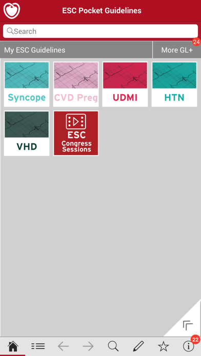 The ESC POCKET GUIDELINES App – Always be up-to-date and never miss any of the current clinical practice guidelines in cardiology! This App contains the following 29 ESC Pocket Guidelines: Adult Congenital Heart Disease (ACHD) Atrial Fibrillation (AFib) Aortic Diseases (AORTA) Cancer treatments and cardiovascular toxicity (Cardio-Onco) Cardiovascular Diseases during Pregnancy (CVD Preg) CVD Prevention in Clinical Practice (CVD Prev) Chronic Coronary Syndromes (CCS) Dual Antiplatelet Therapy (Focused Update) (DAPT) Diabetes, Pre-Diabetes and Cardiovascular Diseases (DM) Dyslipidaemias (Dyslip) Hypertrophic Cardiomyopathy (HCM) Acute and Chronic Heart Failure (HF) Arterial Hypertension (HTN) Infective Endocarditis (IE) Myocardial Revascularization (MR) Non Cardiac Surgery (NCS) ACS in patients without persistent ST-segment Elevation (NSTE-ACS) Cardiac Pacing and Cardiac Resynchronization Therapy (Pacing) Peripheral Arterial Diseases (PAD) Pulmonary Embolism (Acute) (PE) Pericardial Diseases (Pericard) Pulmonary Hypertension (PH) Sports Cardiology (Sports) Acute MI in Patients with ST-segment Elevation (STEMI) Supraventricular Tachycardia (SVT) Syncope (Syncope) Fourth Universal Definition of Myocardial Infarction (UDMI) Ventricular Arrhythmias and Sudden Cardiac Death (VA+SCD) Valvular Heart Disease (VHD) The App includes dedicated folders for easy access to: Summary cards Essential messages Direct links to access related ESC Congress sessions. Additionally, this App provides numerous interactive tools, such as algorithms, scores, charts and calculators. Find all the information you need for guideline-based diagnoses and therapy for your patients in one simple click. Please follow the link below to register for a new account. http://escol.escardio.org/MyESC/modules/User/register_step1.aspx?returnURL=/MyESC/modules/dashboard/default.aspx
