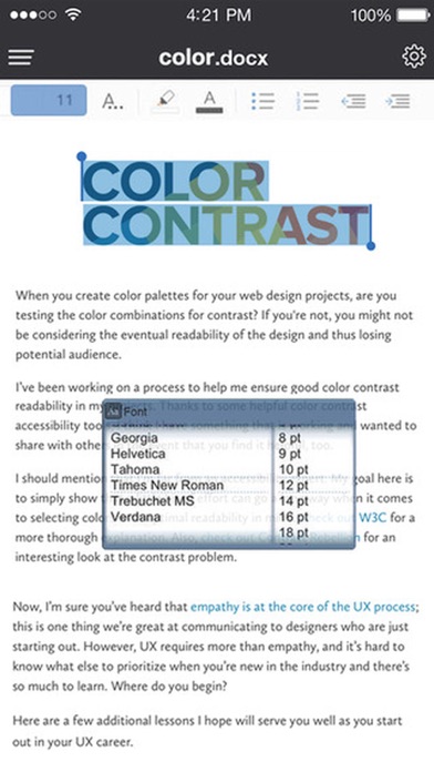 Full Docs, the most intuitive and straightforward office document editor available on the iPad, makes it easy to open, view, create and edit Word (DOC & DOCX), Excel (XLS & XLSX), and PowerPoint (PPT & PPTX) files right from your iPad! Features: WORD PROCESSOR • Create, edit and save Word DOC & DOCX files • Character formatting, including: - Text and fill color - Bold, Italic, Underline - Font face & Size • Paragraph formatting including alignment, line spacing, margins, indenting, bullets and numbering • Support for tables, including table creation • Support for floating and inline images (inserting from camera roll or pasting from other programs) • Support for shapes and floating text boxes • Support for textual tracked changes • Footnotes, endnotes and comments • Multi-column formatting • Supports section breaks, page breaks and column breaks • View headers and footers • Ruler bar with ability to set paragraph margins and tab stops • Searching of text within documents • Undo and redo, up to 100 undo levels • Auto-correction and auto-completion are supported • Spell check • Copy & Paste, even text and images from other applications (including Safari) SPREADSHEET • Create, edit and save Excel XLS & XLSX files • Handle multiple worksheets with unlimited rows and columns • Search and sort cells • Cell formatting: (bold, italic, borders, text and cell color, alignment, text wrapping) • Cell types: General, Number, Currency, Percentage, Date, Time, and Text • Merge cells feature • Pane freezing • Tap and drag to change row heights and column widths • Intelligent auto range selection for range based functions • Tap cells to compose formula • Insert, copy, paste or cut cell ranges, rows or columns • Date formats, date separators and numeric separators are all handled correctly according to the current locale, with manual override • 146 different functions PRESENTATION • View and Slide Show PowerPoint PPT & PPTX files • Slide ordering • Slide show mode with simulated laser pointer • Slide show presentation on external monitor SlideShow To Go full screen mode & better slide navigation alongside EXTRAS • File versioning. Revert to any of the last 10 file versions. • Save documents, spreadsheets and in PDF format • Wireless printing (iOS4.2 and later)