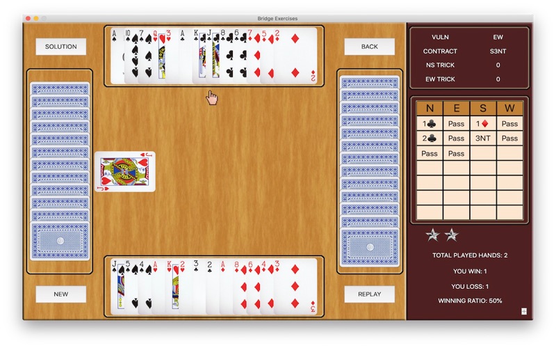 Bridge Exercises It‘s for you to practice bridge, and provide you a lot of classic hands to better understand bridge basic play, it includes: A good bridge declarer relies on a variety of skills, strategies and techniques, it helps you practice more. It's NOT a on-line game, does NOT need internet. It's simply a bridge table that you can learn bridge technique, train yourselves, enjoy bridge master's skills at anytime and anywhere, and a perfect product for you to improve your playing skills. (1) Bridge Exercises It offers tons of declarer play exercises for players of all skill levels to practice playing skills. Level evaluation: 1 star: Winning ratio less than 50% 2 star: Winning ratio more than 50% and leas than 60% 3 star: Winning ratio more than 60% and leas than 70% 4 star: Winning ratio more than 70% and leas than 80% 5 star: Winning ratio more than 80% (2) Bridge Basic Play It SHOWs you a lot of classic hands played by the famous bridge masters with comments to illustrate the various techniques for you to improve your playing skills. The classic hands include safety play, removing play, block and unblock, killing defense, extra chance, etc, which covers all declarer and defense basic playing skills. If you go through all hands with a moment thinking, it would be a noticeable improvement in your playing skill. Tips for you: Don't play to the first trick too quickly. Force yourself to stop and think. Concentrate on the opening lead for a few seconds so you'll remember it later. Decide what it tells you about the leader's length or strength in that suit. Review the bidding. If one of your opponents has bid, try to come up with a general picture of his point-count and his length in the suit bid. Always Count your losers and winners. Hope you become a very good player and have many bridge fun days. (3) Bridge Best Hand of The Year a) The Best Played Hand of the Year (1974-2019) b) The Best Defence of the Year(1985-2019) c) The Best Play by a Junior(1996-2019) d) The BOLS Brilliancy Prize(1977-1987) e) The Best Play of the Year by a Woman(1985-1986) (4) Bridge Bermuda Bowl It includes (Both Open and Close Room) : 1955, 1957, 1959, 1962, 1967, 1973, 1974, 1975, 1977, 1979, 1981, 1983, 1987, 1991, 1995, 1997, 2000, 2001, 2003, 2005, 2007, 2009, 2011, 2013, 2015, 2017 Bermuda Bowl Final. (5) Easy Bridge When and where you want to play Bridge, take it Easy. Just for fun. (6) My Bridge Hands After setting contract info, you can deal cards manually, then play and save them. When you see a memorable play or good hands in one web, or in a game, or in a magazine, newspaper, you can play it in your device, enjoy it at any time.