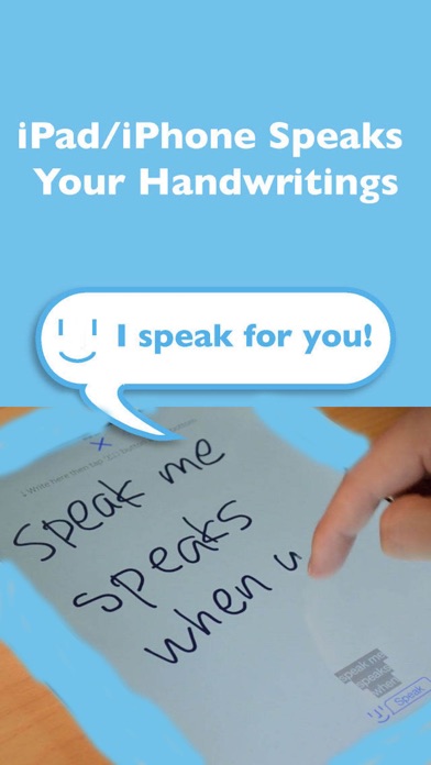 If for some reason you cannot speak, Speak Me speaks for you! You may have a medical problem which does not allow you to speak but by using Speak Me you can communicate with your doctors and loved ones. Simply write on the screen with your finger or use a stylus, then tap Speak button. (Also incorporates keyboard entry and dictionary function.) Speak Me uses "Advanced Handwriting Recognition Technology" which translates your written words into spoken words. Speak Me is also a valuable tool if you are learning to speak English or Japanese. Write the words or phrases you want to practice on the screen and listen to them spoken in the language. Repeat as many times as you need to learn the pronunciations correctly. Stores words and phrases in the log and stores screenshots of the words in your device's camera roll. Watch Video here: http://vimeo.com/77361598 Speak Me is designed for people who may find using a keyboard difficult. A supervisor (probably you) can restrict some features in the app so that the user does not activate those features accidentally. ** Other Features ** • Passcode lock settings ... stops changing settings. • Buzzer ... to attract listener's attention. • Favourites ... tap button to let it speak predetermined words and phrases. • Text typing ... use keyboard to type words to be spoken. • Dictionary ... displays definitions of word you wrote. • Scroll Canvas with Two Fingers • Scratch Out Mistake to Rewrite • Keep log ... store all the words you let it speak. • Screenshots ... store all the words you wrote to device's camera roll automatically. === Supported Recognition Languages === • English (US) • Japanese ※ Network connection is not required when using Speak Me.