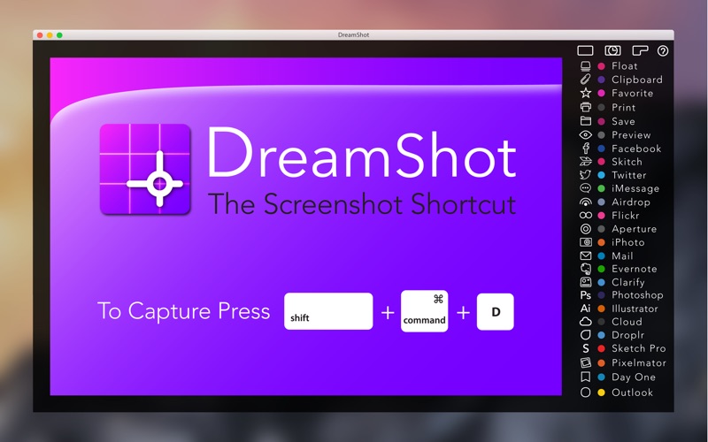 * Stop cluttering your desktop with screenshots — DreamShot lets you send them directly where you want, with one single keyboard shortcut. * Each screenshot taken on your mac has a unique purpose. A specific reason for the capture. You need a method of taking screenshots that accommodates for all use cases, not just one or two. * DreamShot becomes the brains of your screenshot workflow, presenting the most relevant options for dealing with your image. You select a destination, DreamShot sends it, then gets out of the way, with nothing left on your desktop. Try it once, and you’ll never go back. * "DreamShot fixes all of the madness" - David Sparks of Mac Power Users HOW IT WORKS * When you capture an image with DreamShot, you are instantly presented with a large preview of the shot, and a list of options that is generated from the apps and services you use on your Mac. Send the capture anywhere with only one click. You can even print, copy to clipboard, send to Dropbox, custom folders, social networks, or any place that supports image import on your Mac. YOU HAVE SO MUCH TO THINK ABOUT * DreamShot frees your mind from the dozens of shortcuts required to work with screenshots on a Mac. Apps like Evernote, Skitch, Droplr, Cloud, and Voilà all have their own associated shortcuts to remember if you want to send a shot to them. Now you will be able to go to one place, with one shortcut, and have it adapt to why you are taking a particular screenshot, each and every time. FEATURES * Sync your shots between Dreamshot on the Mac and the IOS version. Even viewing your latest shot from your Mac on your Apple Watch. Convenient for referencing a quick bit of info on the go. * Capture with Shift+CMD+D or any custom shortcut you choose. * The menubar panel holds your previous screenshots for easy reuse. * Drag a screenshot from the preview window to anywhere on your Mac. * Hide unwanted destinations from view. * Set a 'Favorites' destination to any place on your Mac. * Instantly see a large preview of your screen capture and retake if needed. * Instantly print, save, copy to clipboard, or open and edit preview. * Responsive developers that love to hear from you! DreamShot All Access Subscription: All Premium Features Unlocked! A $1.99 per Month / $23.99 per Year purchase will be applied to your iTunes account when signed up during or at the end of the 30 day trial period. DreamShot Global Galleries Subscription: A $1.49 per Month / $17.99 per Year purchase will be applied to your iTunes account when signed up during or at the end of the 30 day trial period for the DreamShot Global Galleries feature. Subscriptions will automatically renew unless canceled within 24-hours before the end of the current period. You can cancel anytime with your iTunes account settings. Any unused portion of a free trial will be forfeited if you purchase a subscription. For more information, see our http://silverbeechstudios.com/terms-and-conditions/ and http://silverbeechstudios.com/privacy/. SUPPORTED APPS AND SERVICES: * Imgur * iCloud Sync! * Float * Evernote * Ember * Sketch * Photos * Skitch * Clipboard * Outlook * Mail * Droplr * Flickr * Cloud.app * Pixelmator * Photoshop * Illustrator * DayOne * Print * Save * Preview * Sketchbook Pro * Sketchbook Express * Sparrow * Postbox * Airdrop * Airmail * iPhoto * Aperture * Voila * Clarify * Unibox * Scrivener * iMessage * Mailplane * Thunderbird Please leave a review! REVIEWS Cuttipii * The perfect replacement for Grab Googs185 * I have to say that this application is amazing! Mawniegirl * This App is a dream for my software testing. Not only does it give you quick access to multiple save/share/export options, but the simplicity is just a breath of fresh air. I use iMessage 24/7 and this app is a huge help when I need to take and post photos quickly of what I'm working on. Shootzkden * 5 stars!!! AWESOME APP!! Thanks again!