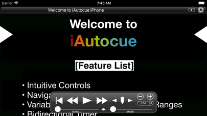 iAutocue is a feature rich teleprompter for iPad designed to be powerful and yet intuitive. Includes a multitude of file sharing methods and remote controls. Display the content on an external monitor and even record video of yourself giving your speech. Check out iAutoscroll, the free remote for iAutocue. Easily configure the appearance of the text content to suit your presentation requirements including... • Font • Font Size • Text Color • Background Color • Head and Tail Indent • Line Spacing • Text Style Prompter features include: • Import File Types: iAutocue (.iAutocue), Text (.txt), Rich Text (.rtf), Word (.docx) and HTML • Export File Types: iAutocue (.iAutocue), Text (.txt), Rich Text (.rtf) and HTML • Five Marker Styles: Bar, Marker, Two Line, Inverted, Two Markers • Scroll Speed: Variable with two speed ranges. • Display mirroring for using a reflective teleprompter • Countdown: Two styles • Bidirectional Timer • External Monitor Support • Built-in user manual • Customizable title bar to give access to the features that are important to your workflow. • More... • File Sharing iAutocue offers a variety of file sharing methods to assist in moving files between devices as well as a computer. - iTunes File Sharing: Copy files to and from iAutocue using iTunes. - Email Files: Email files from iAutocue and open files from other apps such as Mail. - iOS File Sharing: Send files directly from one iAutocue to another. - Web Server: Host a web page that can be used from any computer to upload and download files. - Web Server Browser: Use built-in browser to load web page from another web server to download files or the entire database from another iAutocue. - AirDrop: Use Apple's AirDrop to send files. - iCloud: Upload and download files from iCloud Drive. - Dropbox: Upload and download files from your Dropbox account. - Google Drive: Upload and download files from your Google Drive account. - iOS Remote Sharing: Send files and databases between host and peers. • Remote Control iAutocue has a variety different remote options. - iOS Remote: Use another iOS device running iAutocue or iAutoscroll to control iAutocue. Synchronize multiple devices. - Blue Tooth Keyboard: Assign keys of a blue tooth keyboard to control prompter features. - Touch Tone Remote: Use touch tone signals playing into the microphone line-in to control prompter features. - Audio Remote: Use the headphone in-line remote or other audio remote to control prompter features. - AirTurn Remote: Use wireless remotes from www.airturn.com to control prompter features. - Web Server Remote: Use a web page hosted on the network to control the prompter features. - Apple Watch: Use the Apple Watch to remotely control prompter functions. - Bluetooth MIDI: Use IK Multimedia's iRig Blueboard to control prompter functions. - Game Controller: Use MFi game controllers to control prompter functions. - Touch Recording: Record and playback your interactions with the prompter. - Speech Recognition: Use your speech to control the script using key words or the text content of the script. - Key Commands: Configure key combinations to control most prompter features. • Recording - Use either camera. - Movable video preview overlaying the script. - Share your video in a variety of ways. • Monitor Out Use an external monitor connected to the dock connector or AppleTV to display the prompter content. - Choose output resolution from supported resolutions. - Configure output to match device, or device to match output. - Adjust transform and mirroring for external display independently of device. - Works great with AppleTV and AirPlay. iAutocue on the iPad provides a lightweight and mobile and yet powerful teleprompter solution, text or music reader.