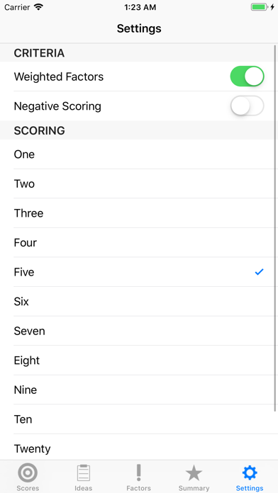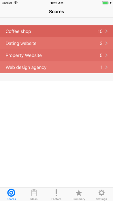 Business Ideas is a simple app that enables you to quickly note down any idea you may have for a business and then easily compare it with your other ideas. Often having ideas is not the problem its choosing the best one and this app helps you to do that, allowing you to focus your efforts on the most achievable and profitable endeavour. Define your own criteria for assessing an idea and give each criteria a weight based on how important you believe that factor is, for example if having low capital start up requirement is more relevant to you then time to market then give it a relatively higher weighting. Once you've added your decision making criteria it's easy to then score your idea against each factor, from -5 very poor to 5 very good. The app totals the scores for easy comparison and a summary page allows you to clearly see your optimal choice.