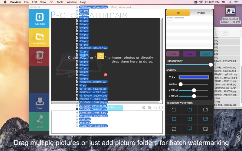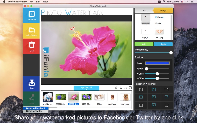 ***** New Version Launch Sale for a Limited Time!!! Regular Price: $9.99 ***** iFunia Photo Watermark is an intuitive picture app for you customizing images with a variety of watermarking options. It enables you to watermark text, images, brand logo on your photos to promote your brand&business, or protect your intellectual property, or simply batch add some useful information to many images at a time. It also support to convert the photos into other popular image formats as needs. Features of Photo Watermark for you to easily watermark photos: 1. Support import your .jpg, .jpeg, .png, .bmp, .gif, .tiff, .ico, .icns, .tga, .psd picture files; 2. Support drag-n-drop multiple images or just add picture folders; 3. You could batch watermark the photos with simple steps; 4. Custom text watermark, including font, color, position, rotation and transparency; 5. You could use a brand logo or image(s) as watermark; 6. Support resize the image watermark and adjust the transparency, shadow, position to create a perfect logo watermark; 7. Support save the text and image watermark as template for future uses; 8. Support import photos directly from iPhoto and Photo Booth; 9. Can batch convert images to other popular image formats as needs; 10. Support batch rename images at a time; 11. All of original photos will be left untouched; 12. Upload your Watermarked photos directly to Facebook or Twitter after finished. Like iFunia on Facebook: http://www.facebook.com/iFunia Follow iFunia at Twitter: https://twitter.com/iFunia Share iFunia on Google+: https://plus.google.com/105722880100861622517/ To keep connected with us and get the latest giveaways, update news and new release.