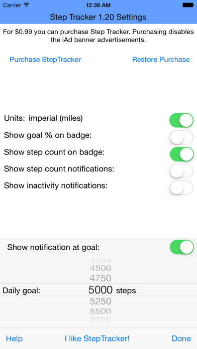 StepTracker turns your iPhone into a pedometer and a fitness tracking device by counting the number of steps you take each day. By monitoring at your step count you can get an idea of how active you have been and learn how to live a more healthy lifestyle. Unlike conventional pedometer apps, StepTracker doesn't need to be running in the background to count your steps. Your motion data is automatically collected by Apple's new M7 motion co-processor in the iPhone 5S. This allows your step count to be monitored even when the app is not running, all without using a significant amount of battery power. StepTracker brings this information to you in a simple and easy to understand way. Simply select the day you are interested in and StepTracker will tell you how many steps you have taken, along with a measure of how much time you have spent active vs. inactive. Features of StepTracker include: •View your complete step count history. Even if you have never installed this app before, you will be able to see your step counts for the last 7 days. •Add text comments to your step count data to remind yourself why you were more or less active on a given day. •Export all of your data via email or text message. •View your step count or distance travelled in miles or km by tapping the step count on the main screen. •Turn your phone sideways to view your step count as a graph! •Share your step count via email, text, Facebook or Twitter with your friends. •Set a daily goal and see how close you have come to achieving it. •Display your or step count on the app icon. •Background app refresh support. You don't even need to open StepTracker to see how many steps you have taken today, the app icon will automatically update to show you your step count on an icon badge. •Game Center support - see how many steps other users have taken via GameCenter or challenge a friend do a step count competition! •Notification Center Widget - Now you can add a widget to show your current steps and current distance right in Notification Center! To install, pull down Notification Center from the top of the screen, click on "today", scroll to the bottom and click "edit" and install StepTracker. StepTracker is iAd supported, but you can disable the ads though an in-app purchase. Please email or tweet me @JaxMyers if you have any feature requests or comments. **This app is designed to work with the iPhone 5S only**