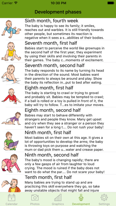 WomanLog Baby (Baby) is a calendar of child development for parents. User interface languages: English, Deutsch, Français, Italiano, Español, Português, Dansk, Nederlands, Svenska, Русский, 简体中文, 繁體中文 Key features: Child Development Calendar Descriptions of child development phases from birth to 3 years Calendar for multiple babies Weight Height Graphs Temperature Bathing Breastfeeding Diaper Sleep Diary Backup Skins (3) iPad support WomanLog Baby Pro: Photo Gallery Bottle feeding Feeding Achievements Medicines Moods Symptoms Doctor's appointments Send PDF file to e-mail Skins (10) No ads All the main functions are accessible via the calendar. Tapping a finger on the calendar date, you can add and edit the settings for each day. Turn the phone horizontally and you will switch to the list of events. Application developers are not responsible for any direct or indirect losses which have arisen or may arise related to using this application. Child development phase descriptions and drawings are to be understood as general and theoretical information that may not be the same or may differ significantly in comparison to each particular child's actual development. General technical data such as phone model, etc., are transferred to www.womanlog.com solely for testing purposes and for statistics. contacts: [email protected] www.womanlog.com © 2019