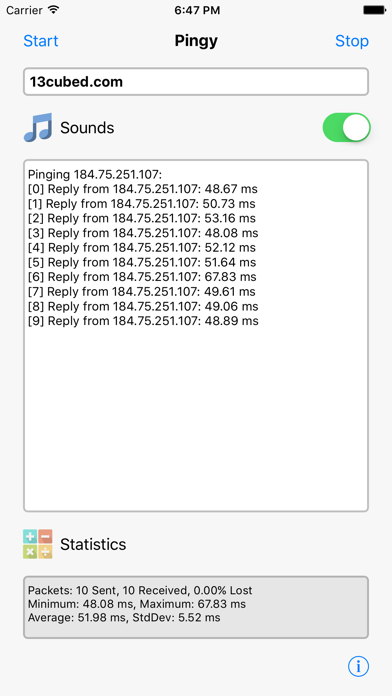 Pingy is a free ping (ICMP echo request/reply) utility with a clean interface and no ads. It's designed to be a lightweight, quick, and easy to use utility to check for basic network connectivity. It calculates sent/received counts, packet loss, and minimum, maximum, average, and standard deviation statistics for round trip time. It also features a ping sound option that will allow you to hear when a ping is successfully received.