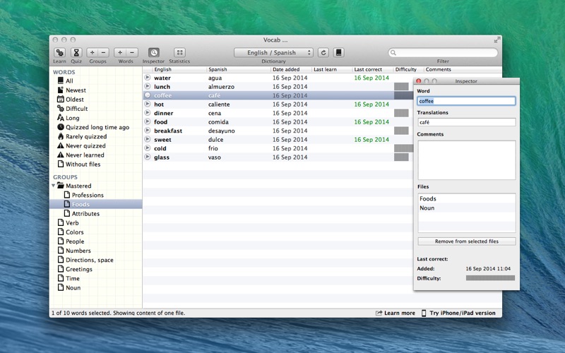 Vocab is powerful vocabulary trainer that tracks your progress so it knows which words you need to train at the moment. Vocab is available on Mac, iPhone and iPad and synchronises your vocabulary automatically with other devices. KEY FEATURES: * Learning and Quizzing You can improve your vocabulary by quizzing yourself and using the learning module. * Filters that track your progress and help learning proper words Vocab adapts to your progress and remembers word that are difficult to you. You use various filters to see which words you need to learn at the specific moment. * iPhone & iPad synchronisation Thanks to Dropbox you can synchronise your dictionaries with all your devices instantly and automatically. Type in your words on Mac and test them on iPhone while out of home! * Huge database of dictionaries Vocab offers several dictionaries ready to use as well as huge online database with words created by users all around the world (via Quizlet.com). * Online pronunciation database Vocab will pronounce your words using online database with many of languages. * Flexible and customisable You can learn many languages, create multiple dictionaries, define synonyms, create files, folders and annotate words with comments * Recognised by media Vocab started as free software in 2010, it was awarded by German press: Vocab was published in printed version and on DVD included for 'MAC & I' special educational issue!