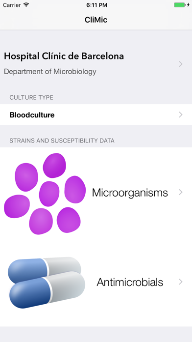 CliMic is a reference of blood culture microorganisms and its antimicrobial susceptibility, aimed at helping the clinician to implement an appropriate empirical antibiotic therapy by knowing the ecology of multidrug resistant bacteria. • Quickly visualize antimicrobial susceptibility results, grouped by isolate or by antimicrobial. • List isolated microorganisms by its frequency according to the different sources of bacteraemia. • Distinguish results between the nosocomial and the outpatient settings. At this time, the app contains data from bacteraemia episodes treated in Hospital Clinic de Barcelona. ----- Antimicrobial resistance has become a public health problem. The surveillance of antimicrobial resistance in the nosocomial setting is among the measures to be taken to control the emergence and spread of multidrug resistant bacteria.