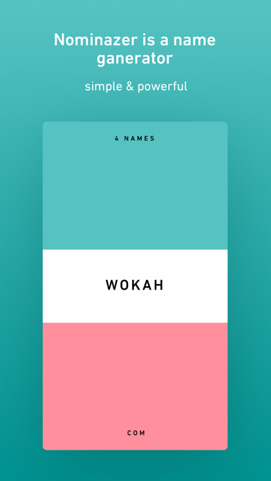 Nominazer finds cool names easily. Features: - Random names generator - Domain checker (.com .net .org) - Favorite name list - Word length edition - Vowel starting option - Share tools If you have suggestions, please send me an email or write a review. Enjoy creating names :)