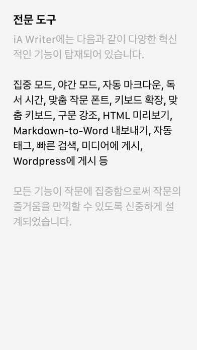 “iA Writer는 깔끔하고, 단순하며 집중할 수 있는 작문 환경을 조성해서 단어에만 온전히 집중할 수 있어요.” ***** The New York Times “iA Writer는 단순함과 쉬운 접근성이 얼마나 강력한 도구인지 보여주는 본보기입니다.” ***** The Guardian “iA Writer를 이용해 그 순간에 필요한 문구, 문장, 단어를 사용하여 적절한 텍스트를 만들 수 있어요.” ***** WIRED App Store 최고의 앱으로 4회 선정 # 간단한 작문 앱 iA Writer는 주의를 분산시키는 요소를 제거하여 생각을 명확하게 표현할 수 있도록 조용히 집중할 수 있는 작문 공간을 제공합니다. # 집중 집중 모드는 현재의 문장 또는 단락을 제외하고 모든 것을 흐리게 만들어 글의 흐름이 끊기지 않습니다. # 시작 형식에 대해 걱정하지 마세요. 먼저 플레인 텍스트로 작성한 후 HTML로 미리 볼 수 있습니다. # 정리 창에서 나가지 않고 클라우드 간에 문서를 검색, 정렬, 변경할 수 있습니다. # 작업 iA Writer의 조명 모드를 사용해 밤낮에 상관없이 작업할 수 있습니다. # 깔끔한 문구 불필요한 형용사, 약한 동사, 반복적인 명사, 틀린 접속사를 발견하여 간결하고 명확한 텍스트로 정리합니다. # 형식 맞춤 템플릿을 설정해 WordPress, Medium, HTML, Microsoft Word(.docx), PDF로 내보낼 수 있습니다. # 100% 텍스트 플레인 텍스트로 링크, 사진, 표, 텍스트 파일을 작성한 후 미리볼 수 있습니다. # 문의하기 - 자세한 정보는 ia.net/writer에서 확인하세요. - 고객지원이 필요하거나 피드백을 제출하려면 ia.net/writer/support를 방문하세요. - Twitter @iAWriter에서 의견을 남겨주세요.