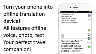Free OFFLINE photo translator, dictionary and phrasebook -- the ultimate foreign language tool when you are abroad! Translate sentences of text without data connection between English and French in offline mode. A must have if you travel to foreign countries - do not rely on Internet and save on data roaming charges! Our unique translation technology often delivers translations that excel Google Translate, Microsoft Translator and Yandex while using much less storage space. It also allows more language pairs than other paid apps having offline translation such as iTranslate. TRANSLATE TEXT - translate offline instantly as you type; - translates from French to English and from English to French; - fully functional translation without internet connection. TRANSLATE WITH VOICE / SPEECH - voice / speech output for both French and English; - allows reading individual words by tapping the desired word in the translation; - fully functional without internet connection. TRANSLATE CAMERA / PHOTO / PICTURE AND OCR - take a picture of printed text and translate it in seconds offline! - available for both English and French; - use this feature to easily convert photos of printed text into editable text in offline mode; - fully functional without internet connection. DICTIONARY / PHRASEBOOK - dictionary and phrasebook between French and English; - recognizes any word form and identifies its features (number, person, gender, etc.) - displays all the translations for a given word; - displayed for single words and collocations; - allows reading individual words by tapping the desired word in the translation; - fully functional without internet connection. FREE VERSION - you will be reminded to support us by using one of our paid apps; You can test the translation without buying the app at http://offlinetranslator.com If you encounter problems with the app, please contact our customer support!