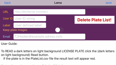 Automatic License Plate Reader (ALPR) for Californian license plates. This app will read Californian license plates on your iPhone or iPad. Point the camera at a license plate and click read and the app will read the license plate. The app will compare the license plate to a list of up to 3000 license plates on your iPhone. No internet connection is needed. You can add decoded plates to the list or edit the list file (PlateList.csv) manually using iTunes file-sharing. You can set the app to SAVE an image of the plate when you save the plate number. The application has a SCAN mode where it will automatically grab images at 1sec intervals (on iPhone 6 or above or iPad) and compare any plates found to its list of plates in PlateList.csv. If the plate is found the number is highlighted. Your iPhone or iPad must be connected to an external power supply to run in AUTO mode. You can email the list of plates you have gathered to yourself in a csv file.