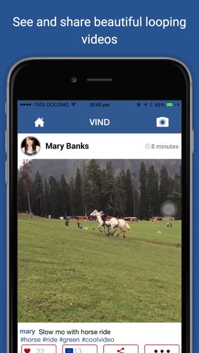 Vind is a great way to see and share life in motion. Create short, beautiful, looping videos in a simple and fun way for your friends and family to see. • Unlimited uploads and free • Instantly post videos on Vind, then share on Facebook (more coming soon!) • Find, follow, and interact with people close to you • Explore trending posts, featured hashtags and editor's picks • Tag friends • Explore channels • And so much more