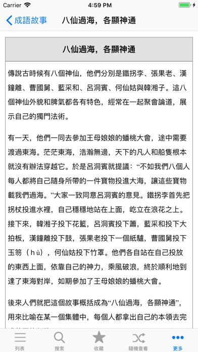 收录了近六万条成语以及近千条经典成语故事, 同时提供了分类浏览模式, 比如可以按描写季节、心情、天气、人物,出自名人、名著等方式来查看成语。 每条成语包含了发音、释义、出处、示例、近义词、反义词等详细内容,使用操作方便简洁,强大的查询服务提供模糊查找、指定位置查找等, 离线内容一次下载之后不再消耗网络流量,是一款不可多得的学习与了解成语的工具。